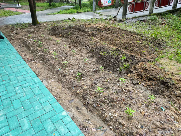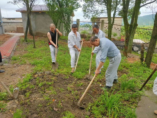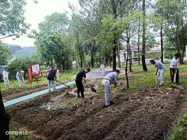 今天的任務十分“艱巨”,要將生活區后院改造成菜園。大家熱情高漲,自發地分成多個小組墾荒,前面拿鐵鍬的剛翻完地,后面緊接用鋤頭鎬出田壟,現場一派熱火朝天的景象,忙而不亂,秩序井然。