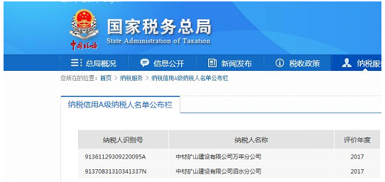 最近,從國家稅務總局官網查詢到中材礦山建設有限公司萬年分公司榮獲2017年度“A級納稅信用企業”,這項榮譽稱號是國家稅務對中材礦山萬年分公司在依法納稅等各方面工作的認可,也是萬年分公司辛勤努力的結果,同時表明中材礦山萬年分公司將會有更多的稅收優惠政策和發展機遇,為今后的經營工作和財務工作提供了便利,為公司健康可持續發展奠定了基礎。