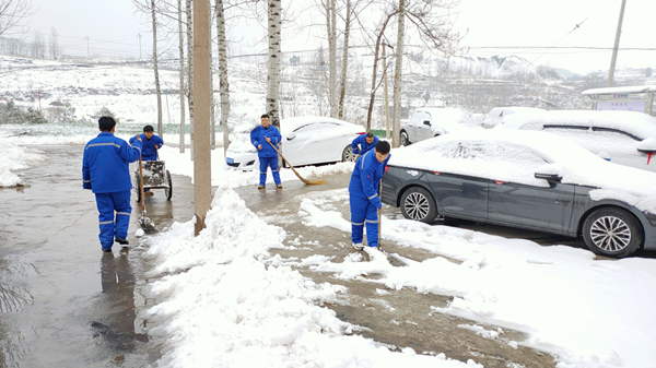 雪天寒冷,也抵擋不住全體職工對(duì)生活和工作散發(fā)的熱情和溫暖,“鏟雪官”們?cè)诎灼悍止境蔀橐坏懒聋惖娘L(fēng)景線。